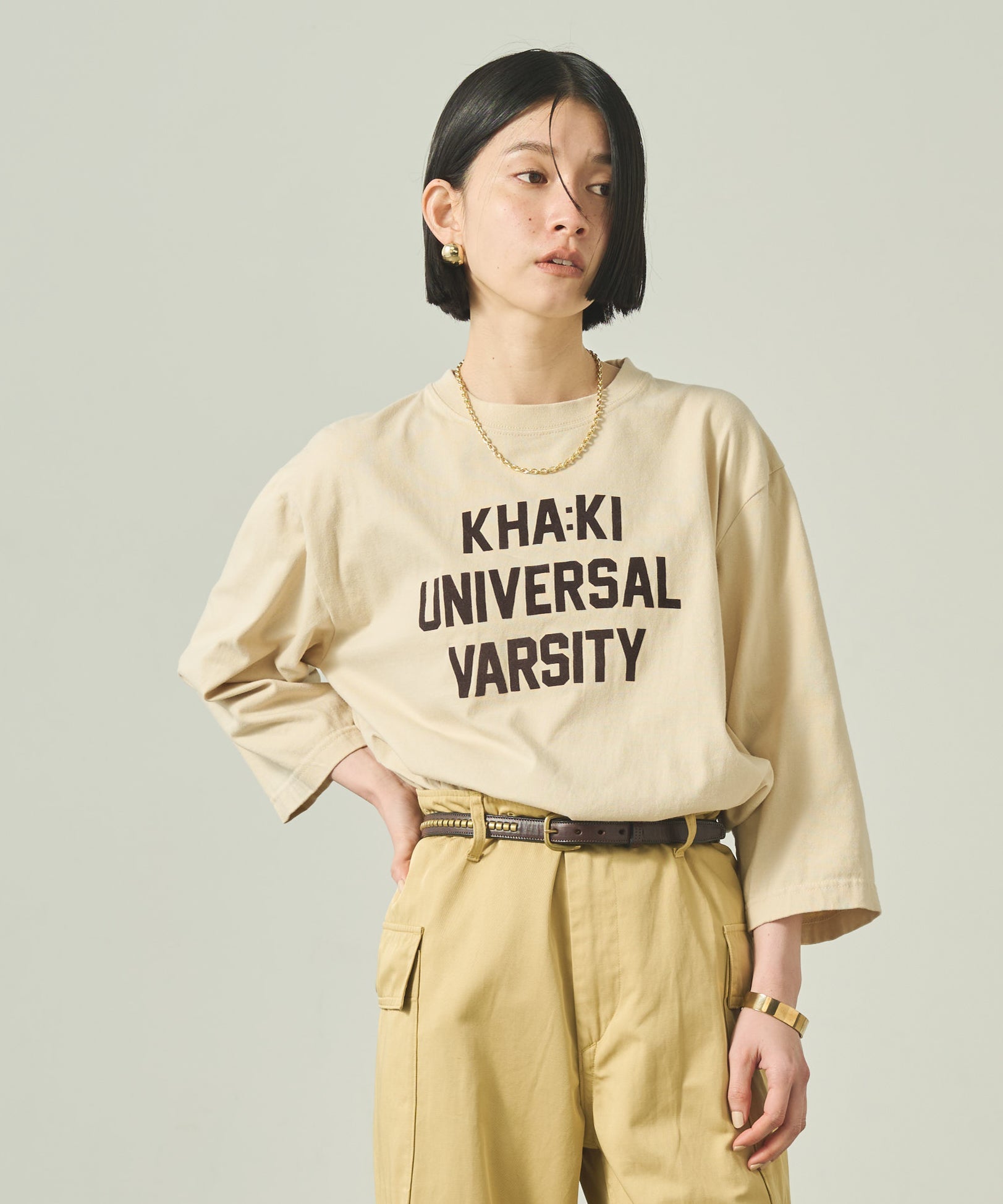 ブランド名カーキはオリーブ、キャメルなどミリタリーウエアの色全般を差すコトバとして使われているちょっと変わった色。もともと土ぼこりを意味した「KHA:KI」今では誰もが日々慣れ親しんでいる色。いつも身近ににあるカーキ―色。ミリタリーウエアの様ないつまでも枯れない普遍性。ずっと長く着続けて欲しい。そんな思いがこのブランドには込められています。