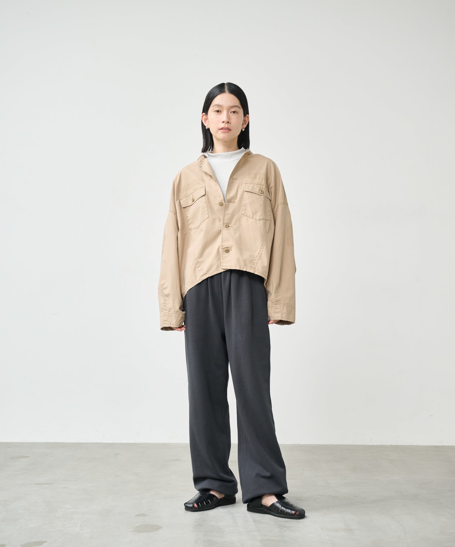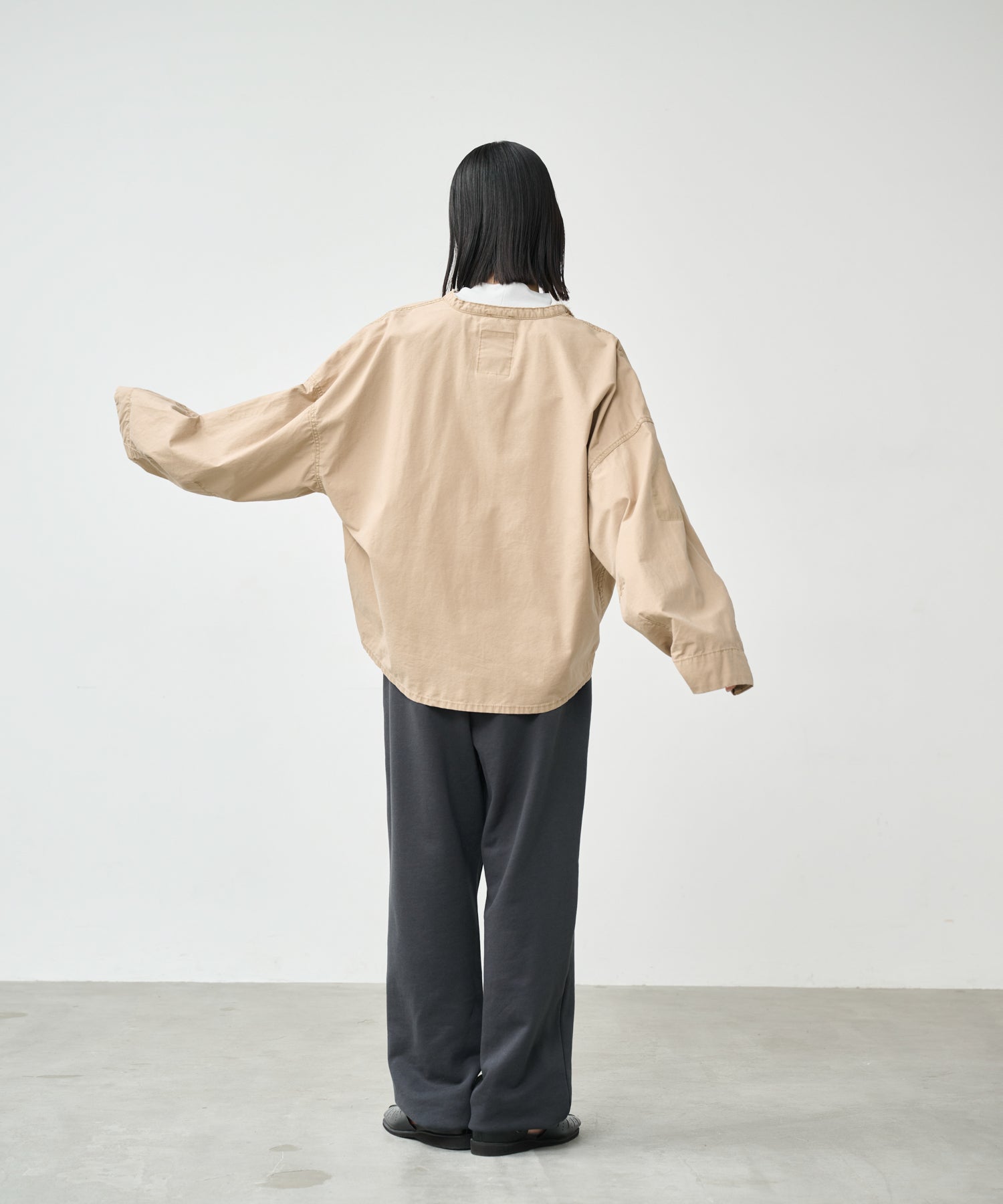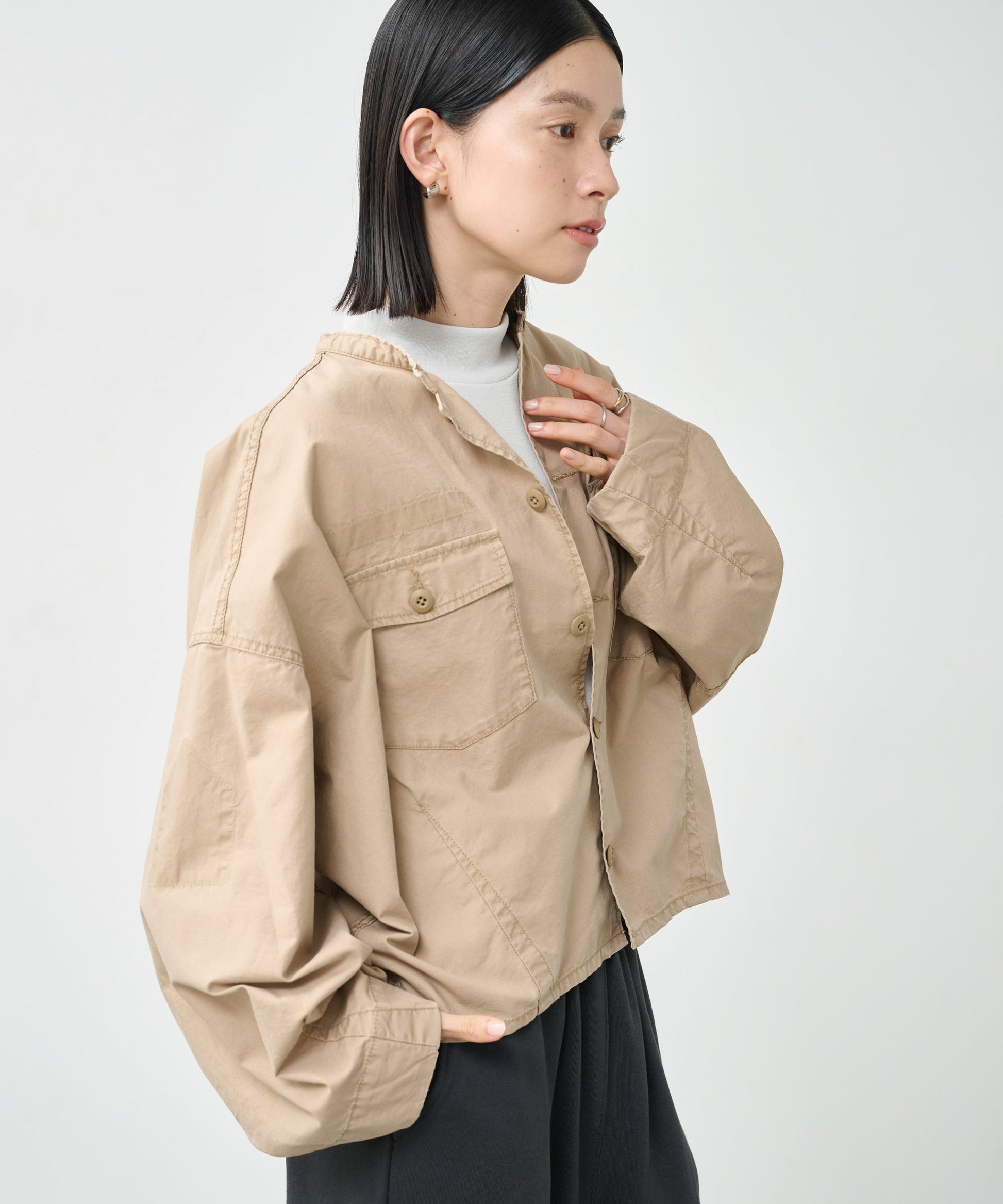 衿はカットオフ始末でラフな印象に。