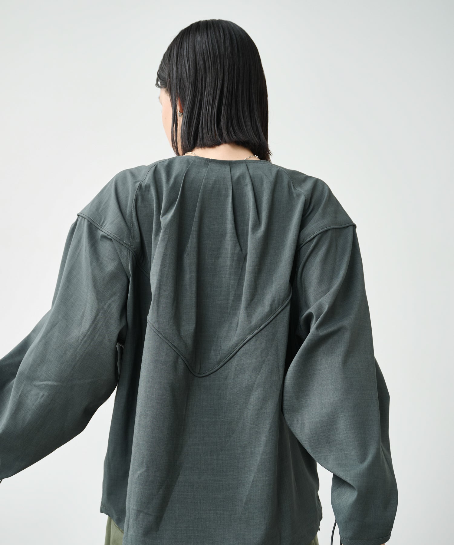 袖のスピンドルを調整することで、丈感とボリュームのアレンジができ、絞った際のドレープ感が特徴的なアイテムです。