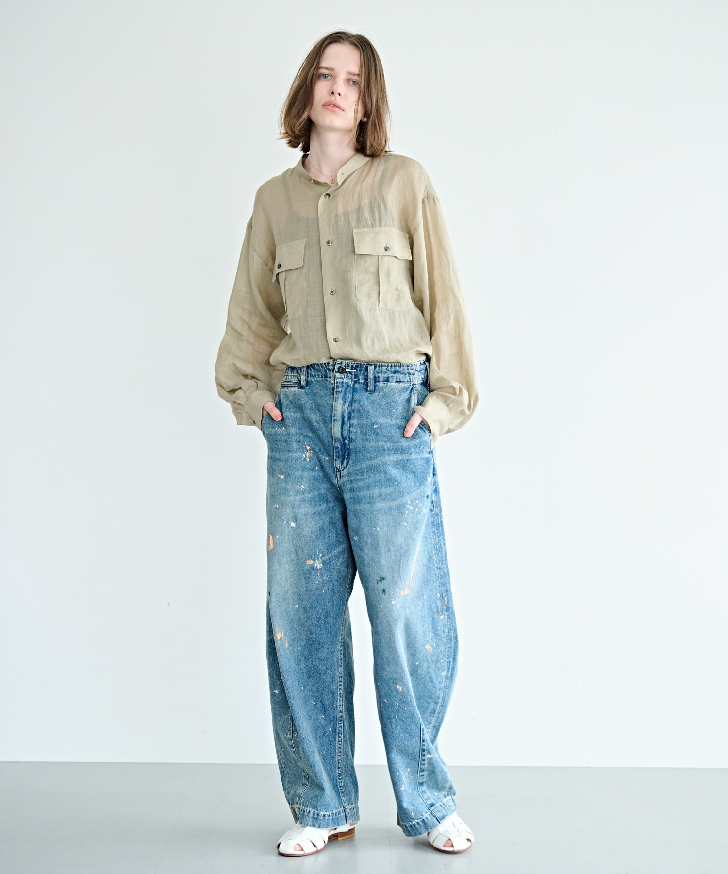NO。09で展開しているOVAL WIDE TROUSERSをベースに職人の手作業で一本ずつペンキを飛ばしを行なったインパクトのあるコクーンシルエットのワイドパンツです。